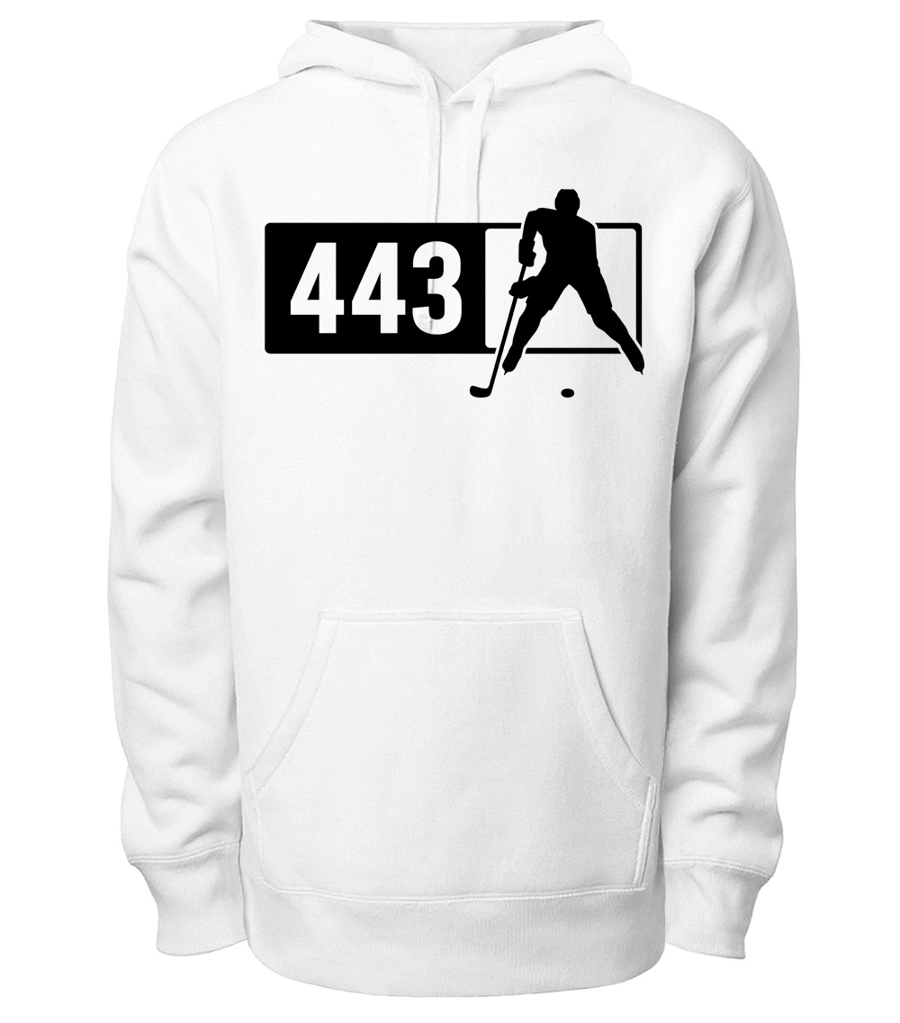 This premium blend hoodie proudly displays the Maryland area code 443 in combination with our trademark silhouette. The fabric weight is 8.8 ounces and made from 65% ring spun cotton and 35% polyester. Wash on cold and air dry.