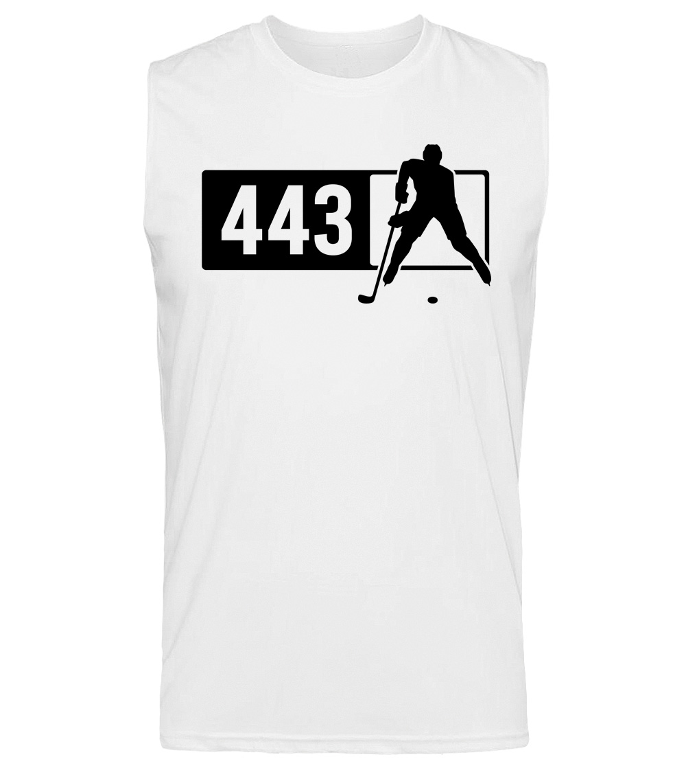This premium sleeveless muscle shirt proudly displays the Maryland area code 443 in combination with our trademark silhouette. The fabric weight is 4 ounces and made from 100% polyester. Wash on cold and air dry.