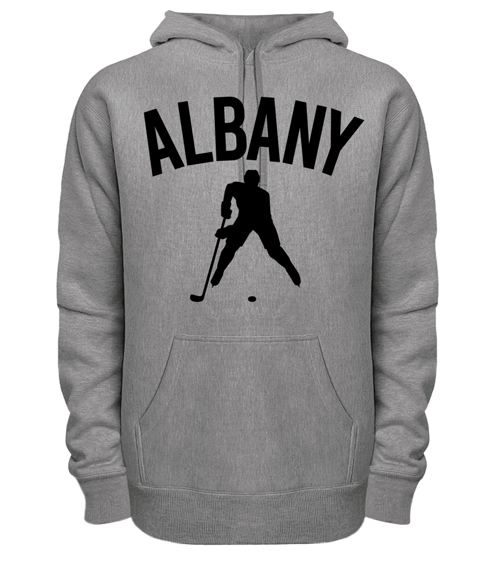 This premium blend hoodie proudly displays the hockey loving city of Albany, USA in combination with our trademark silhouette. The fabric weight is 8.8 ounces and made from 65% ring spun cotton and 35% polyester. Wash on cold and air dry.