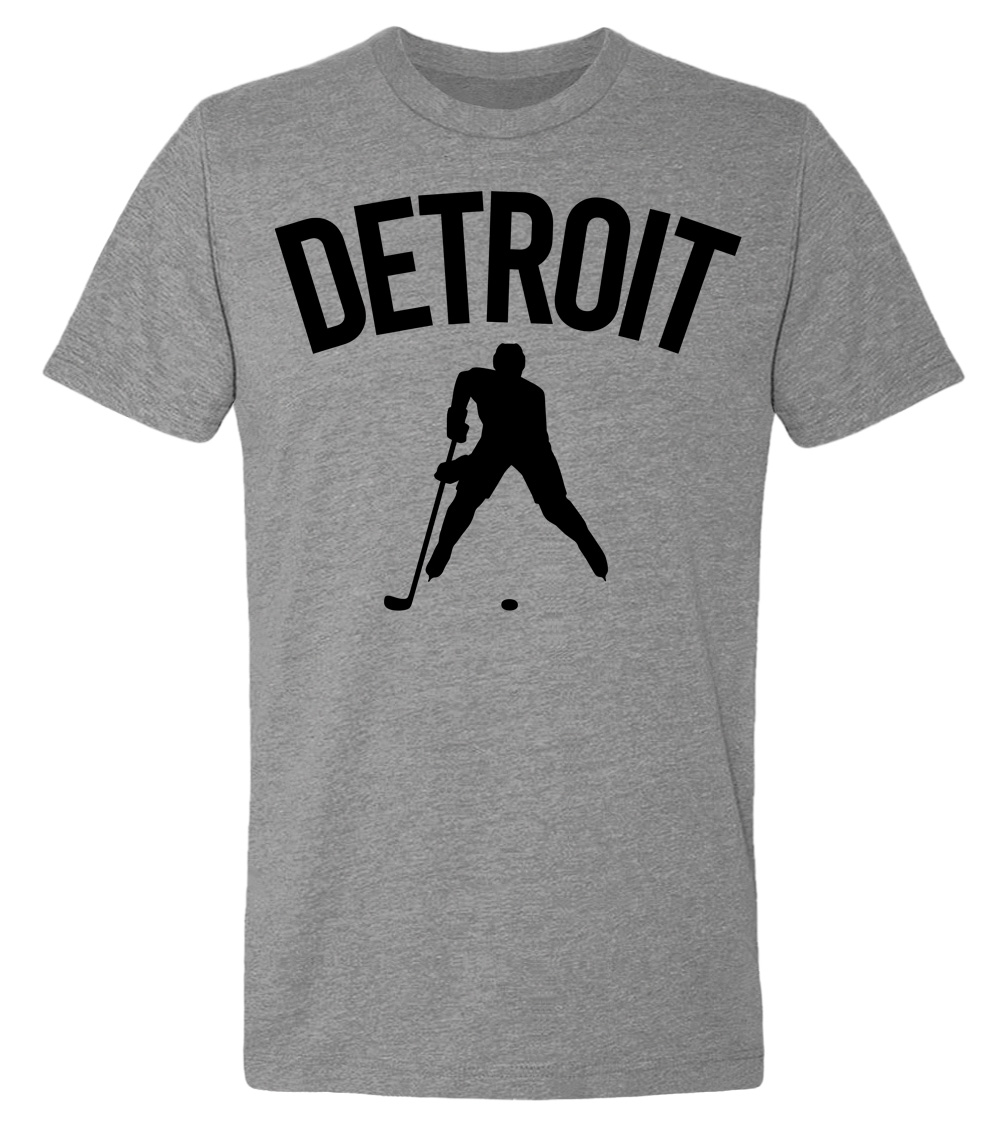 This premium tri-blend short sleeve shirt proudly displays the hockey loving city of Detroit, USA in combination with our trademark silhouette. It's design #1 of 2 for Detroit. The fabric weight is 4.5 ounces and made from 25% ring spun cotton, 25% rayon, and 50% polyester. Wash on cold and air dry.