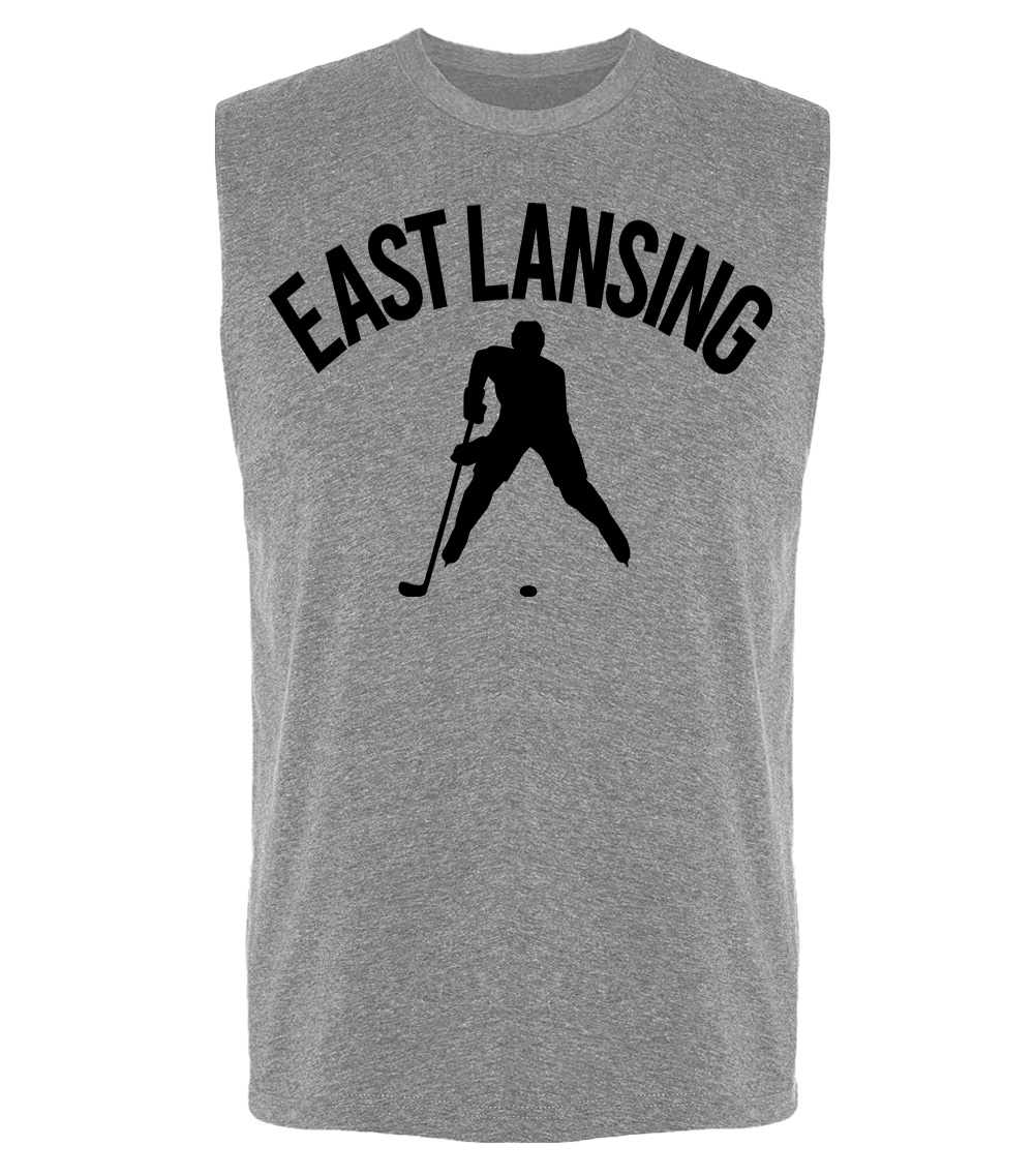 This premium sleeveless muscle shirt proudly displays the hockey loving city of East Lansing, USA in combination with our trademark silhouette. The fabric weight is 4 ounces and made from 100% polyester. Wash on cold and air dry.