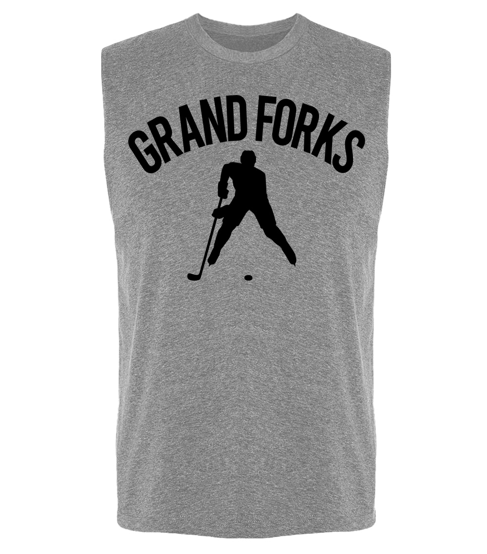 This premium sleeveless muscle shirt proudly displays the hockey loving city of Grand Forks, USA in combination with our trademark silhouette. The fabric weight is 4 ounces and made from 100% polyester. Wash on cold and air dry.