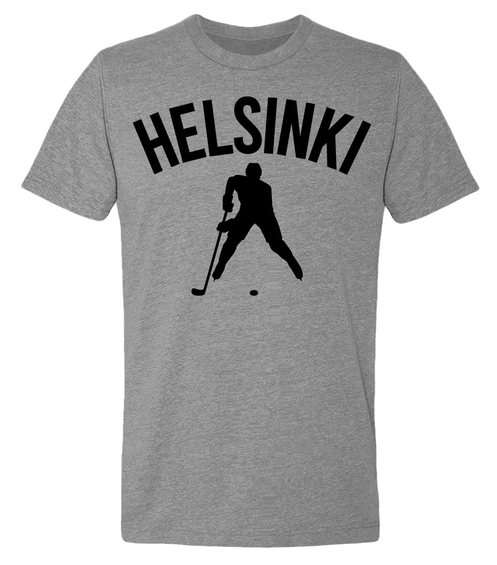 This premium tri-blend short sleeve shirt proudly displays the hockey loving city of Helsinki, FINLAND in combination with our trademark silhouette. The fabric weight is 4.5 ounces and made from 25% ring spun cotton, 25% rayon, and 50% polyester. Wash on cold and air dry.