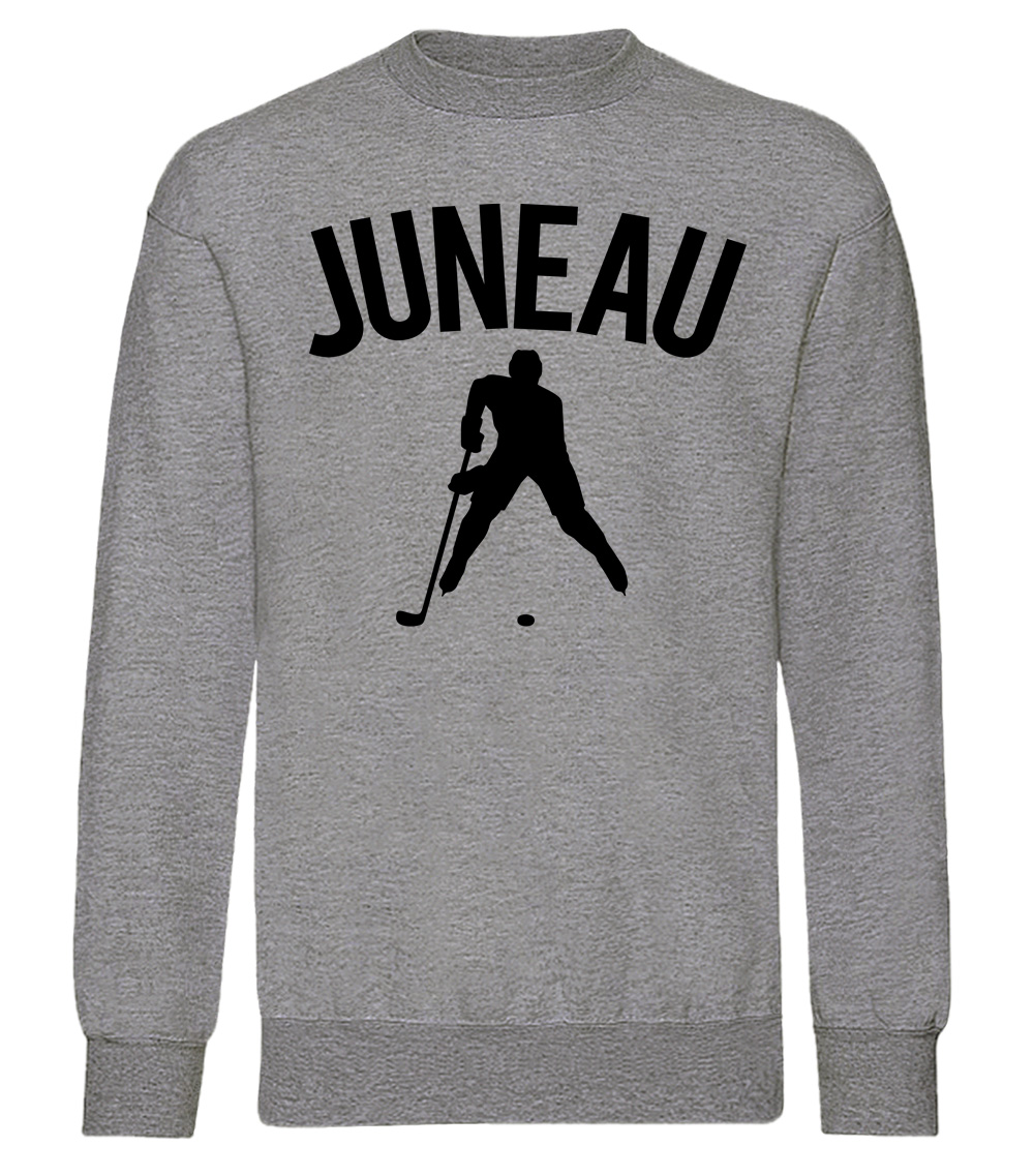 This premium blend sweatshirt proudly displays the hockey loving city of Juneau, USA in combination with our trademark silhouette. The fabric weight is 8.8 ounces and made from 65% ring spun cotton and 35% polyester. Wash on cold and air dry.