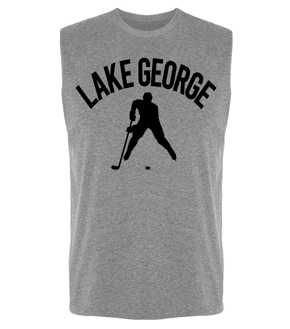 This premium sleeveless muscle shirt proudly displays the hockey loving city of Lake George, USA in combination with our trademark silhouette. The fabric weight is 4 ounces and made from 100% polyester. Wash on cold and air dry.