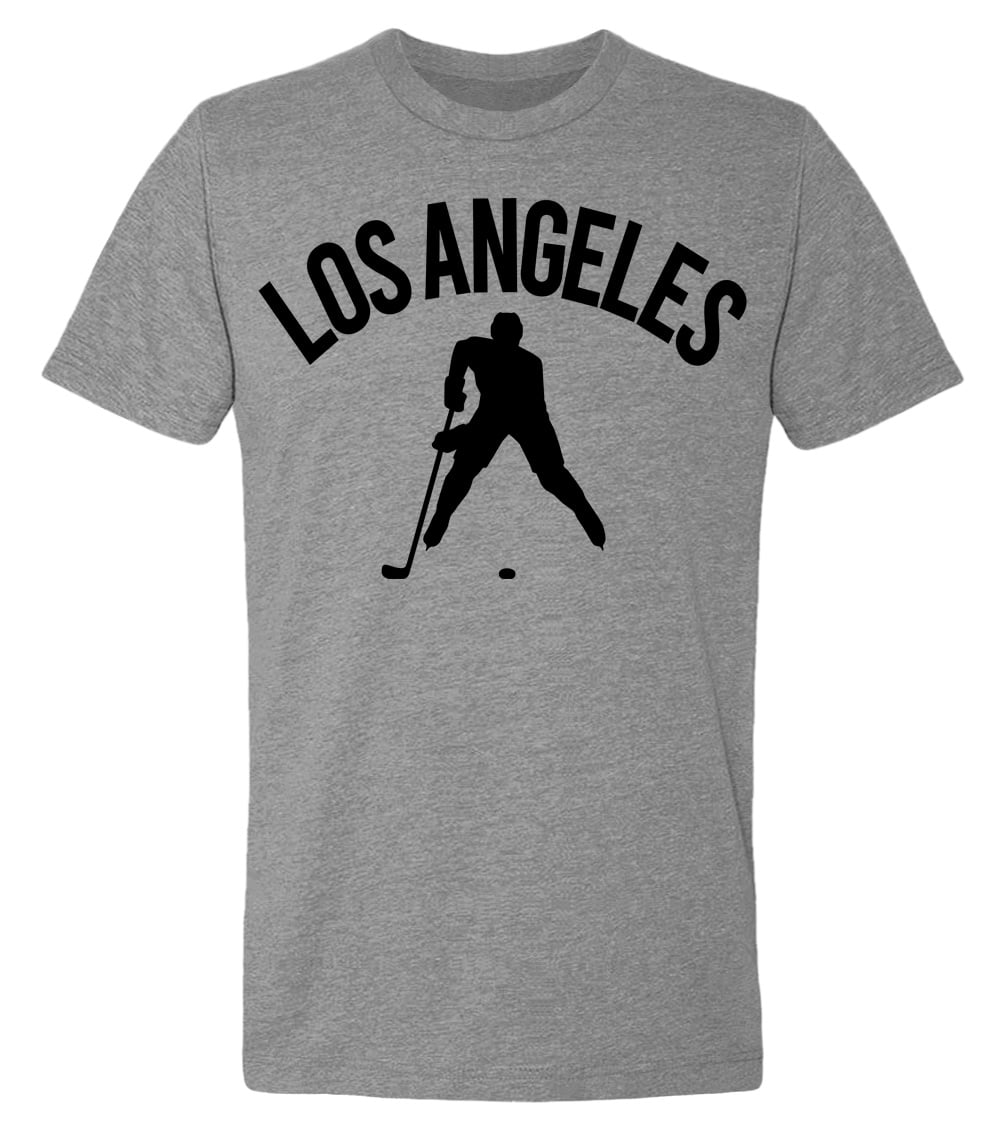 This premium tri-blend short sleeve shirt proudly displays the hockey loving city of Los Angeles, USA in combination with our trademark silhouette. It's design #1 of 2 for Los Angeles. The fabric weight is 4.5 ounces and made from 25% ring spun cotton, 25% rayon, and 50% polyester. Wash on cold and air dry.