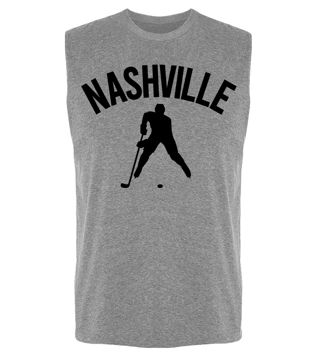 This premium sleeveless muscle shirt proudly displays the hockey loving city of Nashville, USA in combination with our trademark silhouette. The fabric weight is 4 ounces and made from 100% polyester. Wash on cold and air dry.