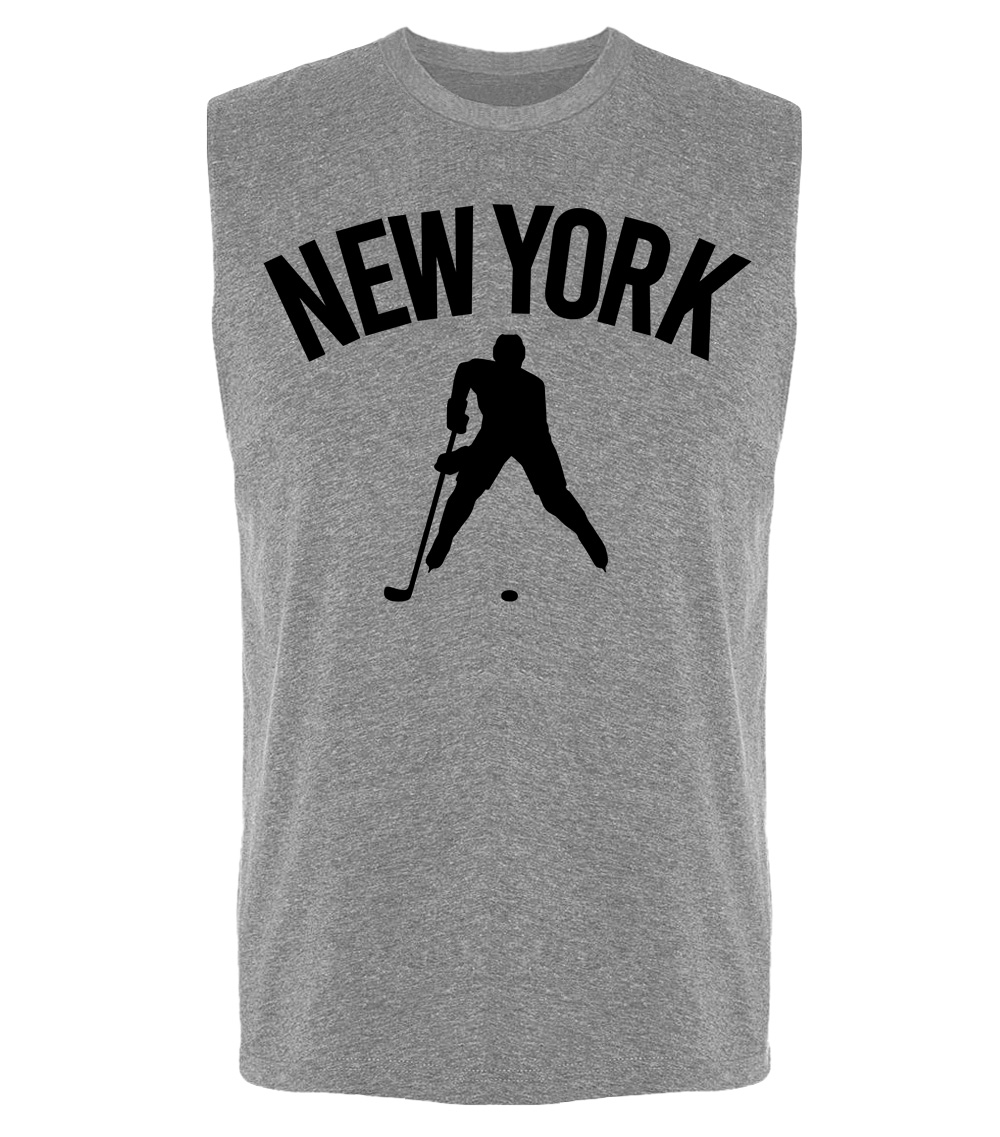 This premium sleeveless muscle shirt proudly displays the hockey loving city of New York, USA in combination with our trademark silhouette. It's design #1 of 4 for New York. The fabric weight is 4 ounces and made from 100% polyester. Wash on cold and air dry.