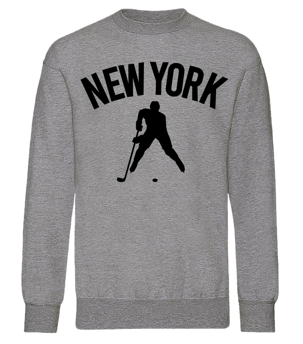 This premium blend sweatshirt proudly displays the hockey loving city of New York, USA in combination with our trademark silhouette. It's design #1 of 4 for New York. The fabric weight is 8.8 ounces and made from 65% ring spun cotton and 35% polyester. Wash on cold and air dry.