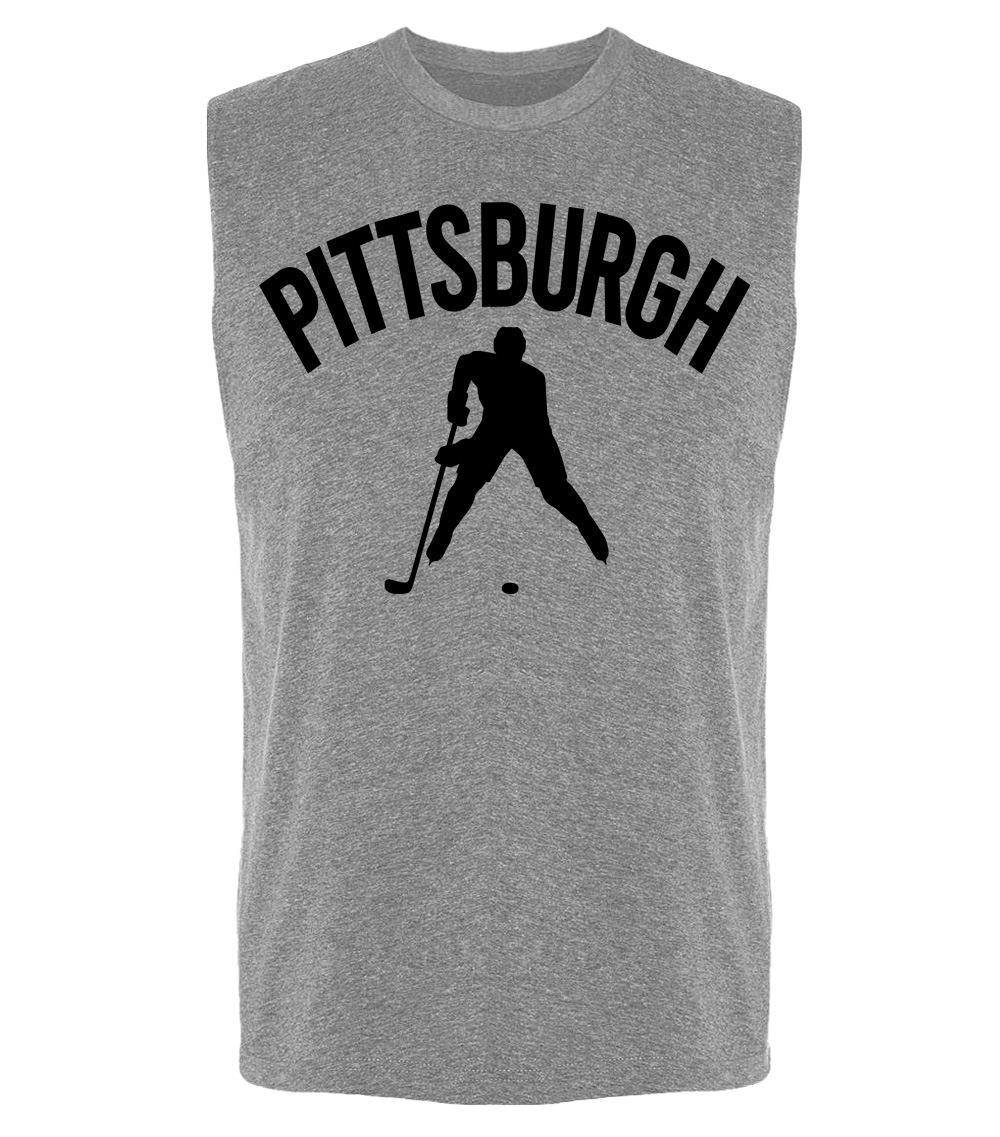 This premium sleeveless muscle shirt proudly displays the hockey loving city of Pittsburgh, USA in combination with our trademark silhouette. It's design #1 of 2 for Pittsburgh. The fabric weight is 4 ounces and made from 100% polyester. Wash on cold and air dry.
