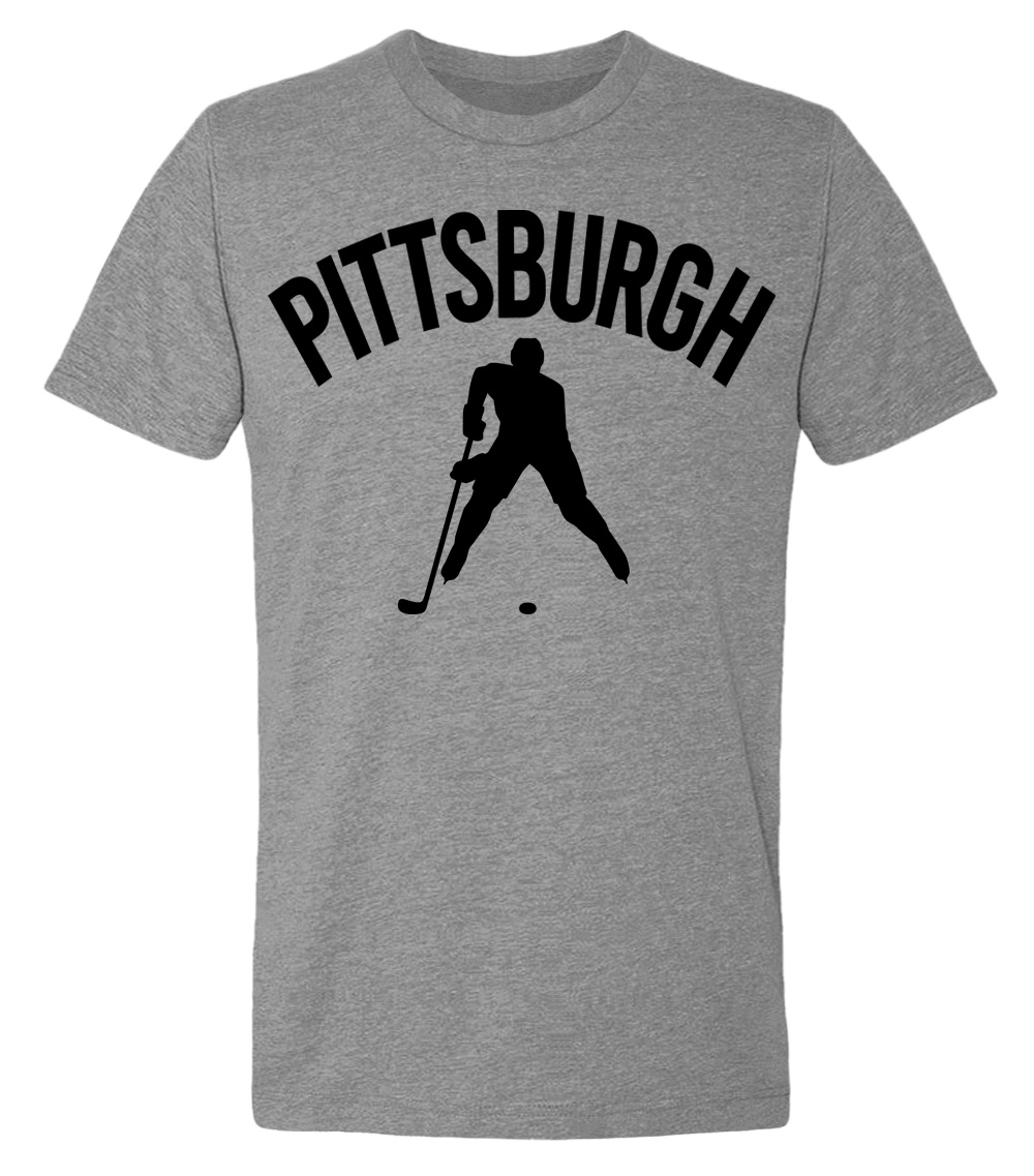 This premium tri-blend short sleeve shirt proudly displays the hockey loving city of Pittsburgh, USA in combination with our trademark silhouette. It's design #1 of 2 for Pittsburgh. The fabric weight is 4.5 ounces and made from 25% ring spun cotton, 25% rayon, and 50% polyester. Wash on cold and air dry.