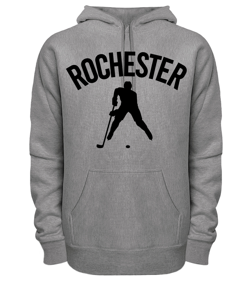 This premium blend hoodie proudly displays the hockey loving city of Rochester, USA in combination with our trademark silhouette. The fabric weight is 8.8 ounces and made from 65% ring spun cotton and 35% polyester. Wash on cold and air dry.