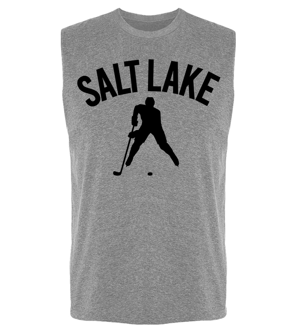 This premium sleeveless muscle shirt proudly displays the hockey loving city of Salt Lake, USA in combination with our trademark silhouette. The fabric weight is 4 ounces and made from 100% polyester. Wash on cold and air dry.