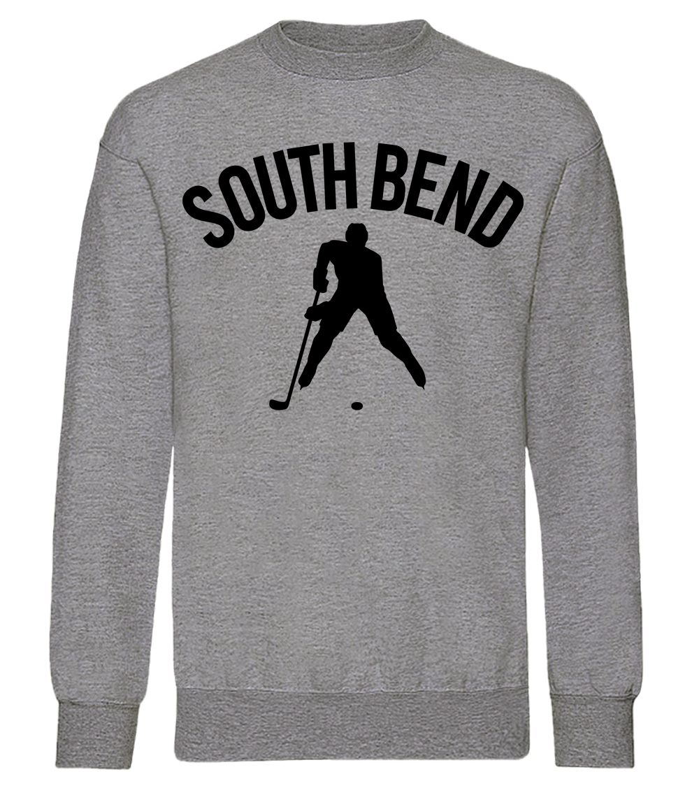 This premium blend sweatshirt proudly displays the hockey loving city of South Bend, USA in combination with our trademark silhouette. The fabric weight is 8.8 ounces and made from 65% ring spun cotton and 35% polyester. Wash on cold and air dry.