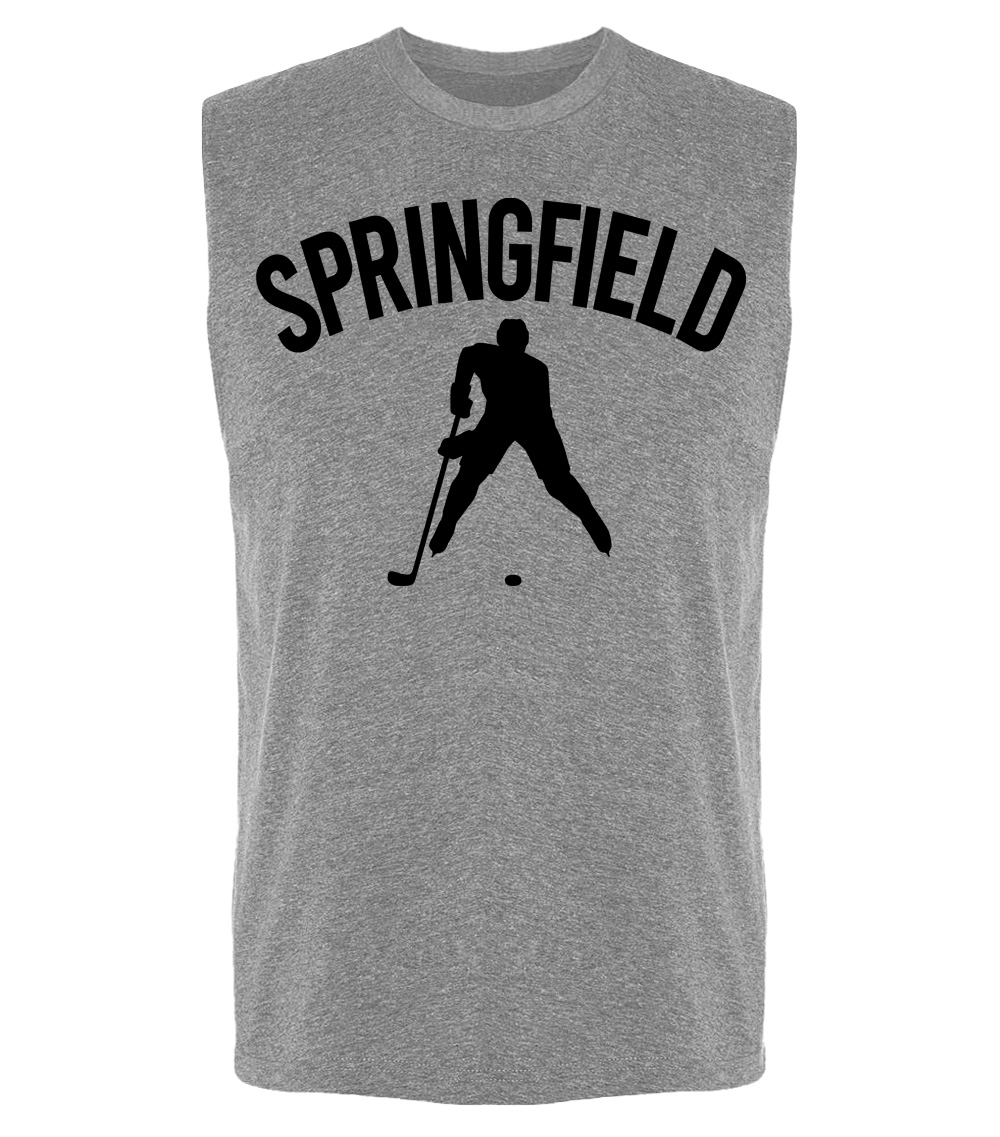 This premium sleeveless muscle shirt proudly displays the hockey loving city of Springfield, USA in combination with our trademark silhouette. The fabric weight is 4 ounces and made from 100% polyester. Wash on cold and air dry.