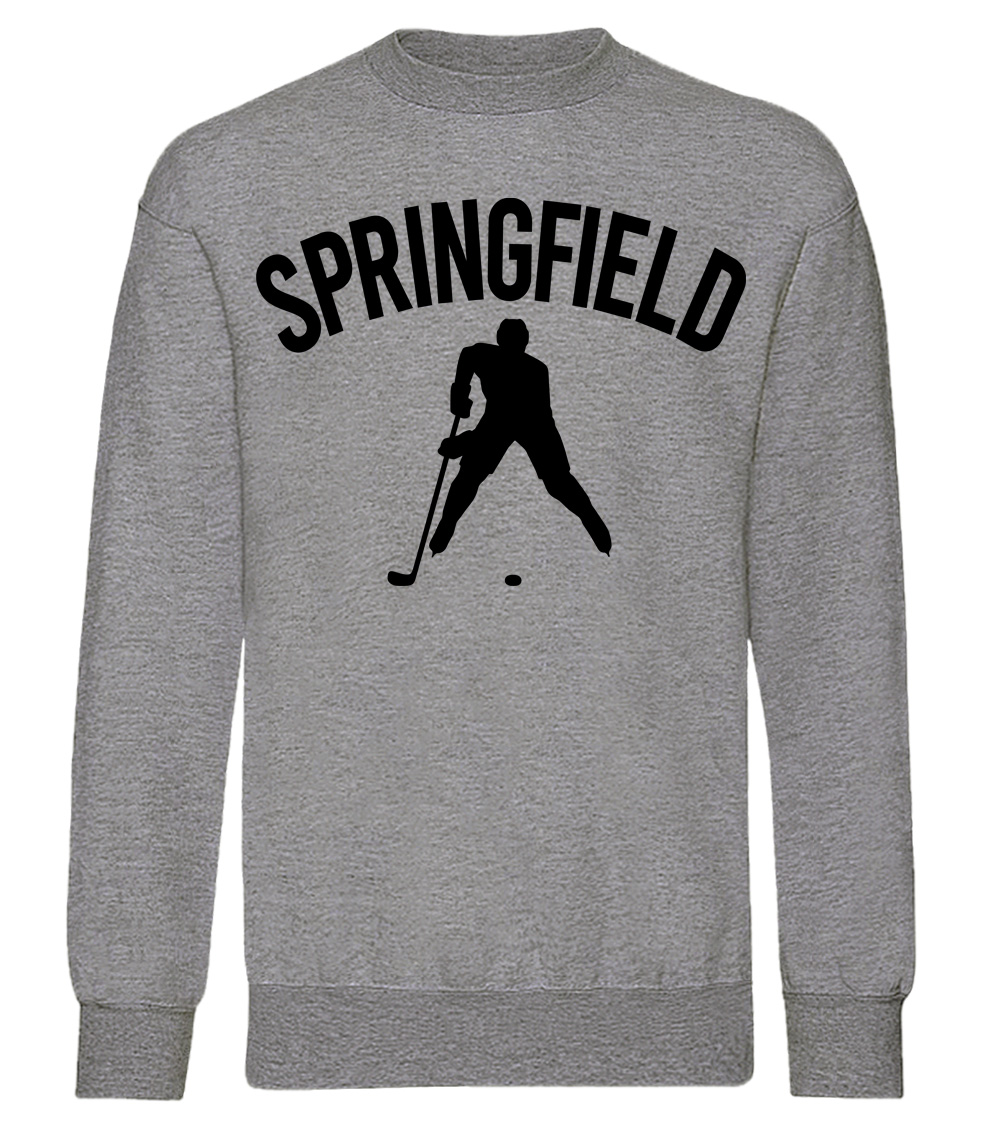 This premium blend sweatshirt proudly displays the hockey loving city of Springfield, USA in combination with our trademark silhouette. The fabric weight is 8.8 ounces and made from 65% ring spun cotton and 35% polyester. Wash on cold and air dry.