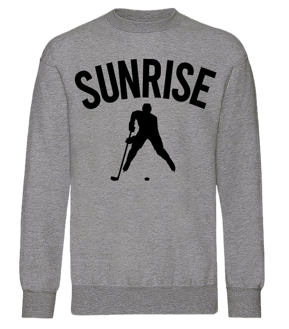 This premium blend sweatshirt proudly displays the hockey loving city of Sunrise, USA in combination with our trademark silhouette. The fabric weight is 8.8 ounces and made from 65% ring spun cotton and 35% polyester. Wash on cold and air dry.