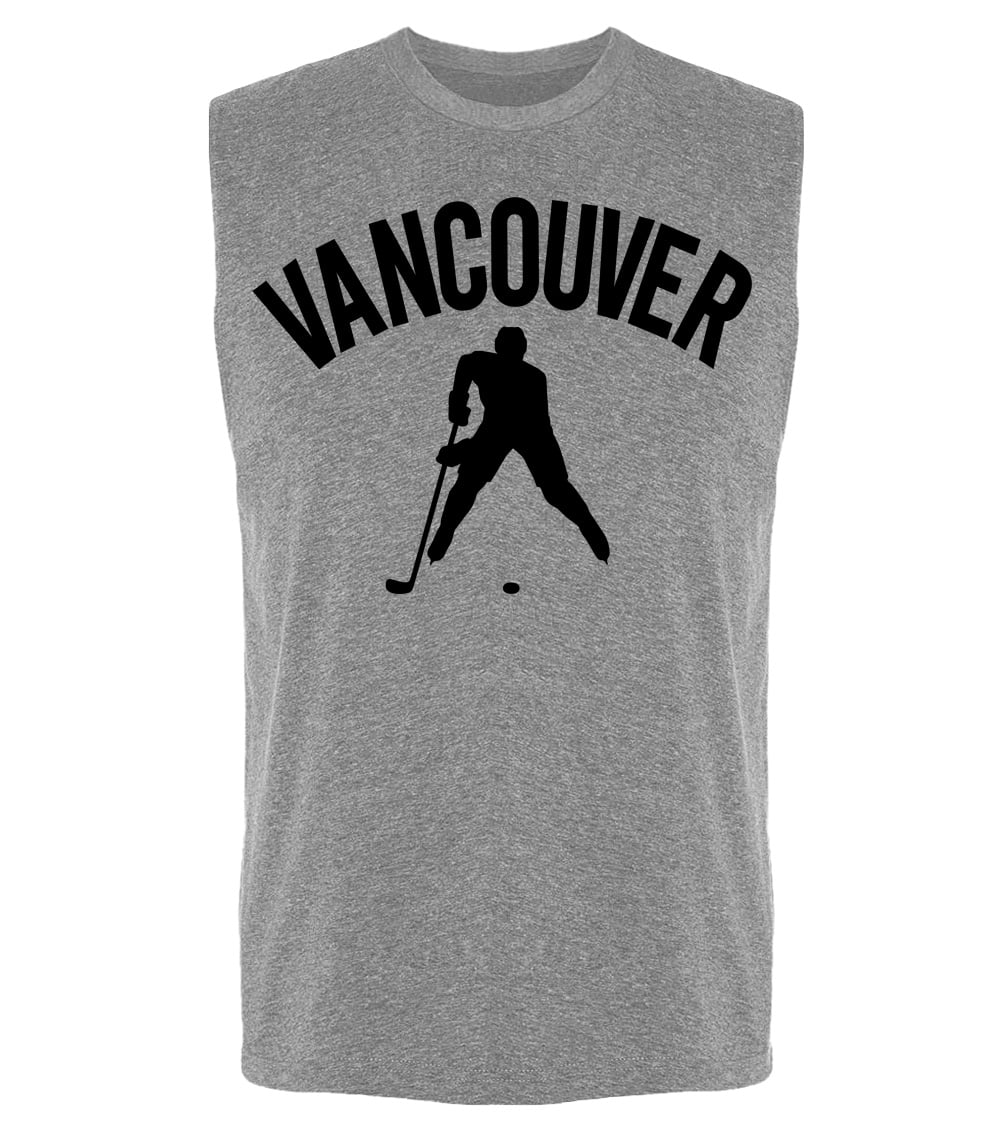 This premium sleeveless muscle shirt proudly displays the hockey loving city of Vancouver, CANADA in combination with our trademark silhouette. The fabric weight is 4 ounces and made from 100% polyester. Wash on cold and air dry.